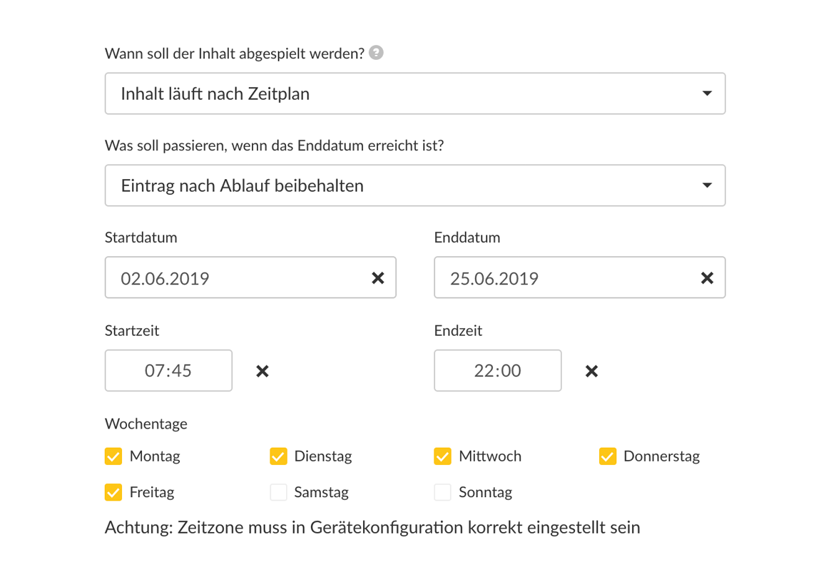 Playlist-Management und Zeitsteuerung Playlists effizient organisieren und das richtige Timing für deine Inhalte Heute möchten wir dir eine kurze Einführung zu Playlist Management und Zeitsteuerung von Bildschirmen und Inhalten mit viewneo geben. Verschachtelte Playlists und wofür sie gut sindWusstest du schon, dass du eine Playlist bei viewneo in einer anderen Playlist verwenden kannst? Wir nennen das verschachtelte Playlists. Wie das geht zeigt dir das folgende Tutorial:  Use case ansehen Zum Tutorial Zeitsteuerung für Inhalte festlegen Ab wann ein Inhalt morgens läuft und wann er abends das letzte Mal gezeigt wird, kann für einzelne Inhalte oder ganze Playlists definiert werden. Zeitsteuerung für Bildschirme einstellen Du verlässt dein Geschäft um 19 Uhr, möchtest deine Schaufensterwerbung aber noch bis 22 Uhr weiterspielen lassen?  Mit dem viewneo Display Timer Plugin legst du fest, wann dein Digital Signage Player den Bildschirm in den Standby-Modus schaltet. Mehr erfahren Dein viewneo Team |