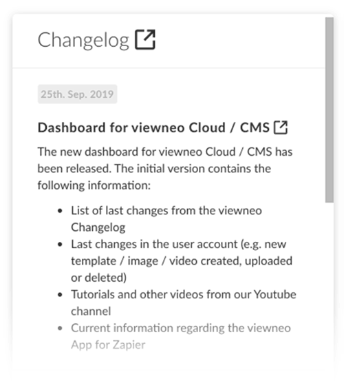 All the important information in one place - with the new viewneo home screen Dear Partner,sometimes important information can get lost in the shuffle. To help prevent you from missing out on important updates, we’ve developed a new start window to display the most relevant information about viewneo. The viewneo DashboardOnce you log into the system an easy to read overview will provide all of the relevant details.  On the left side, a changelog will be displayed. Here you will find all of the important system adjustments arranged in chronological order. It will also provide information on software updates, bug fixes, and information on new viewneo features at a glance.  Under the heading “Recent Changes” you will find the most recent activities of your accounts. This allows you to quickly see what customers are doing in their accounts and how they are using viewneo.  Our YouTube channel is an important way that we share information about our latest products and features. So, you don’t miss anything, we have included a feature in the overview which will display our most current viewneo YouTube video. So, you don't need to switch between multiple windows.  We are constantly working to add new features and Plugins to viewneo. To make sure you are aware of our latest features, we’ve also added a featured product section at the bottom right. We hope this new feature will help to make our communication even more transparent and provide a place for you to get all the latest news, activities, and changes related to viewneo. If you have any ideas of suggestions about this feature, we would love to hear your feedback. Have a nice day and see you soon! Your viewneo Team Help and SupportFeel lost? Get support right from the sourceRead the documentation Find detailed information, FAQs and more in the viewneo Docs. Join the discussion Get answers from other users in the viewneo Forum. Ask our team Send your request and get support from our team. |